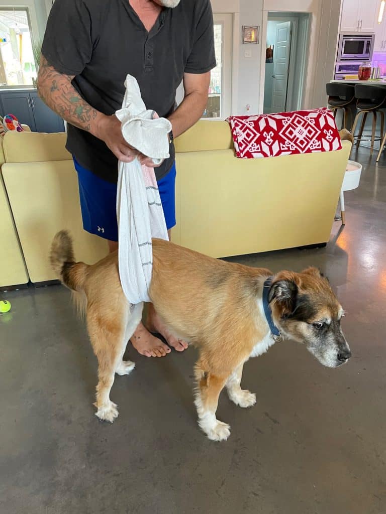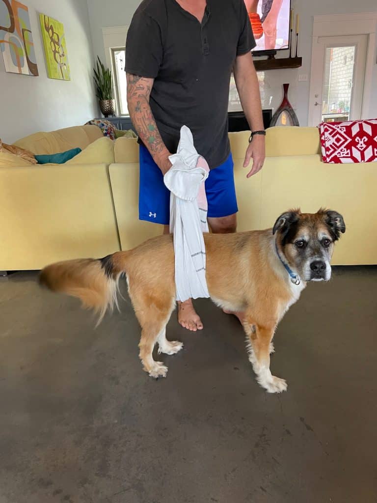 If you’re hiking with a partner, you can put a towel or blanket under your pooch and each lift an end to create a makeshift stretcher.
