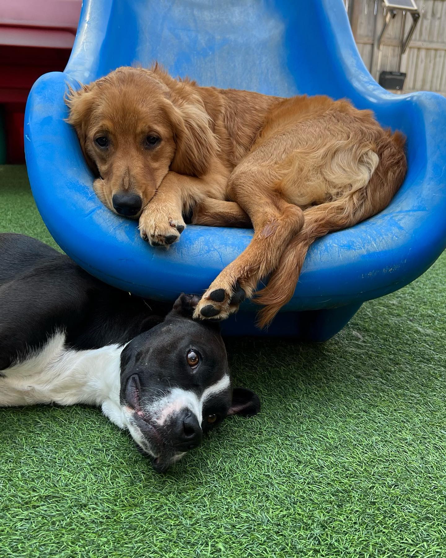 Hounds Lounge doggy daycare offers a healthy dose of physical as well as mental stimulation! Being around hoomans and other woofs all day is a recipe for a sleepy pooch. As we like to say at Hounds Lounge: Play hard. Nap harder!